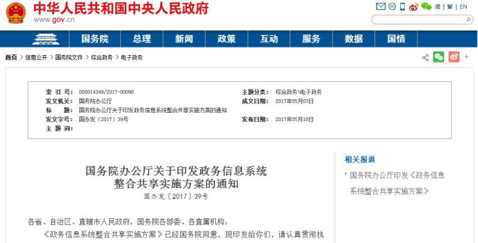 2017年5月,國務(wù)院辦公廳下發(fā)《關(guān)于印發(fā)政務(wù)信息系統(tǒng)整合共享實(shí)施方案的通知》(國辦發(fā)〔2017〕39號)。要求: