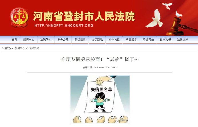 據(jù)介紹,河南省登封市法院在全省首創(chuàng)給老賴們“定制”手機(jī)彩鈴。“我們就是要在老賴朋友圈‘高調(diào)公布’他是失信被執(zhí)行人,他是欠錢不還的老賴,讓他們精神上有壓力,以此敦促他們自覺履行義務(wù)?!?/span>登封市法院執(zhí)行局負(fù)責(zé)人楊軍說。